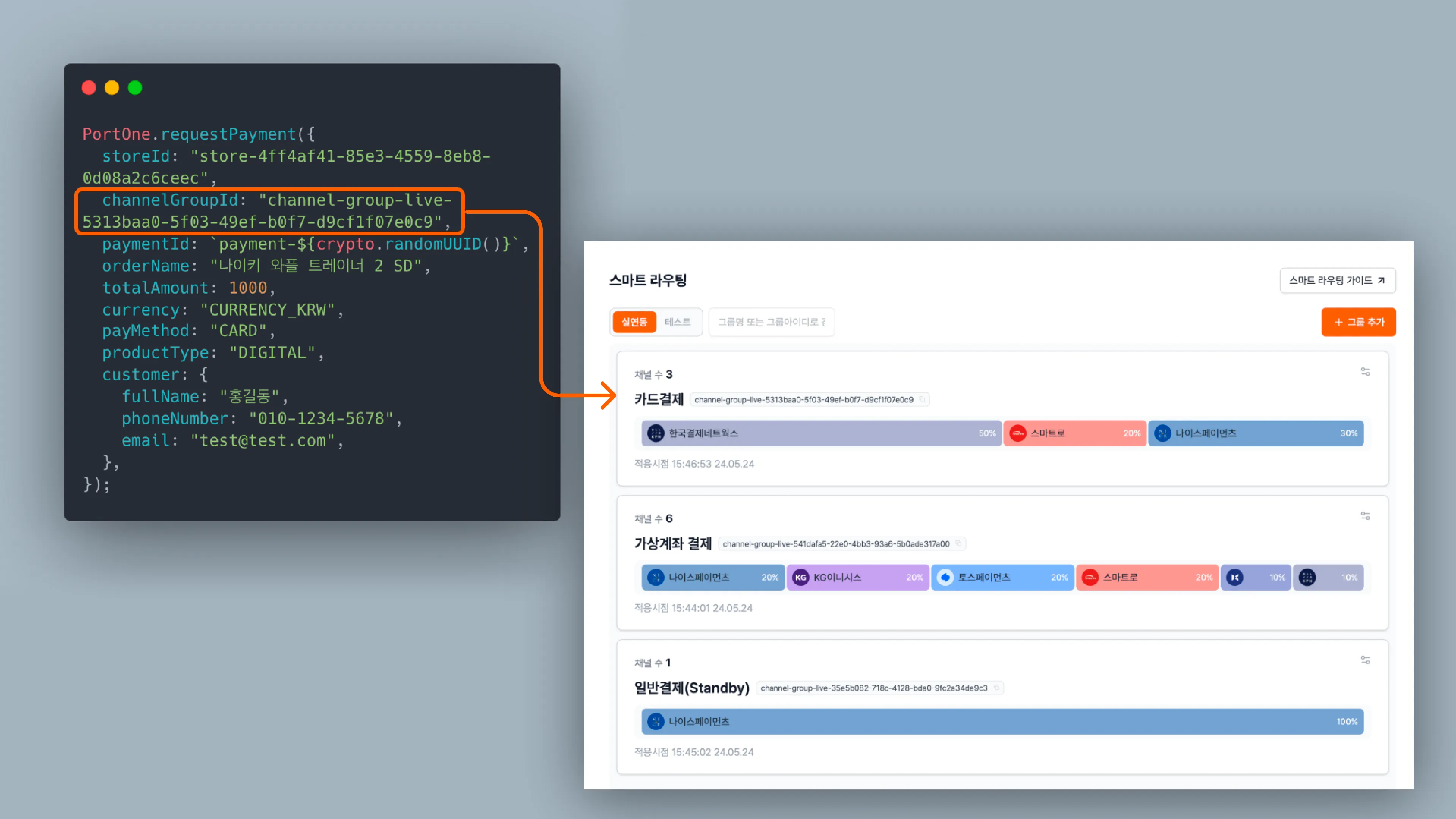 스마트 라우팅을 사용하기 위해서는 포트원 관리자콘솔 내 [연동 관리] - [스마트 라우팅]에서 그룹 설정이 필요합니다. 자세한 내용은 스마트 라우팅 그룹 설정 가이드에서 확인할 수 있습니다.